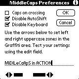 | Tired of doing the two-stroke-business all the time you want to write capital letters? You can choose which part of your graffiti-area becomes permanently assigned to capital-letters, i.e. every letter, which is started in this area is being capitalized. You need Hackmaster installed to use it. | |