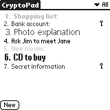 | Need a safe place for all your passwords and bank-account transaction numbers??? Cryptopad is a freeware-replacement for the Memo-application which uses strong encryption to protect your data. Although it is not meant as a complete lock for the Palm it is very usable for encrypting passwords of all kind. | |