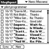 | Due to the fact that the m100 comes without the default Mailtool, you need something else: MsgAgent is a nice and quite small Email/News-Reader which can be synced via a Mobile or a fixed Internet-connection. This works really great with my GPRS-cell-phone. | |